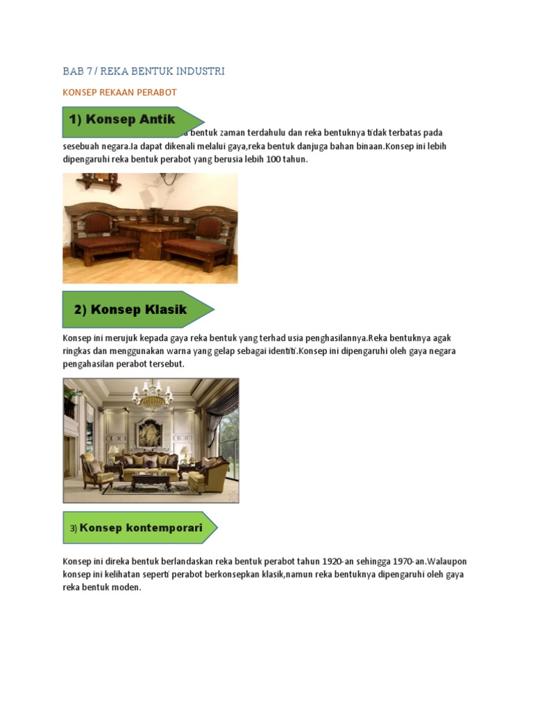 KONSEP REKAAN PERABOT ANTIK berasaskan gaya reka bentuk zaman terdahulu tidak terbatas pada sesebuah negara dapat dikenali melalui gayareka bentuk dan juga bahan binaan reka bentuk perabot yang berusia lebih 100 tahun KLASIK merujuk kepada gaya reka bentuk yang terhad usia penghasilanny a agak ringkas menggunakan warna yang gelap sebagai. Konsep Rekaan Perabot Semasa mula menghasilkan idea bagi mereka bentuk sebuah perabot pereka bentuk perlu mempertimbangkan konsep yang akan dijadikan rujukan pada rekaan perabot yang hendak dihasilkan. QUIZ NEW SUPER DRAFT.